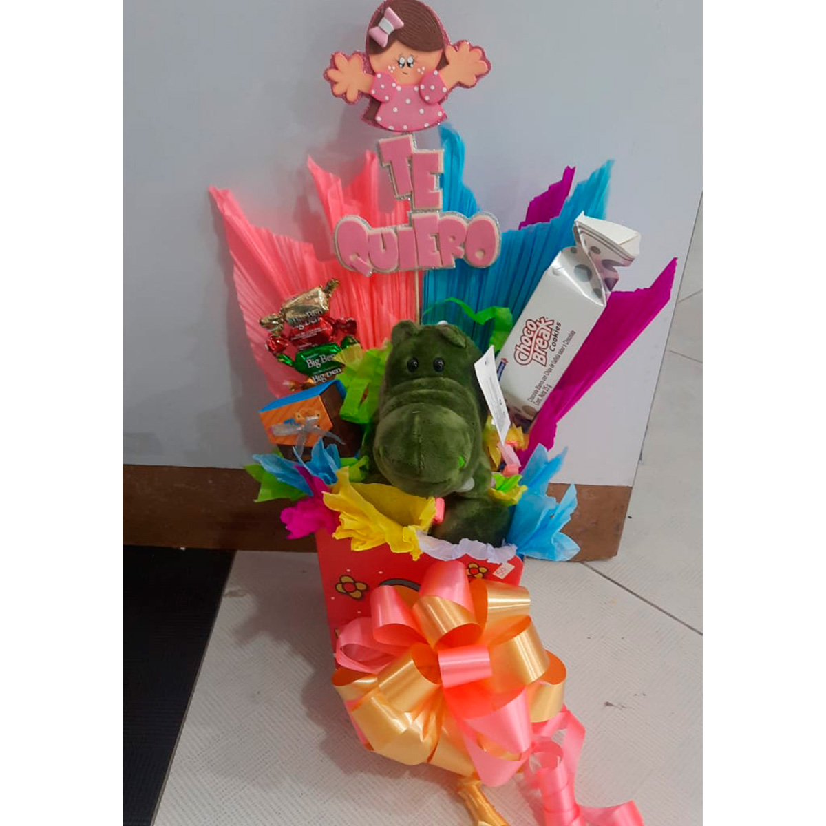 Ancheta con peluche pequeño, globo metalizado y tarjeta personalizada.