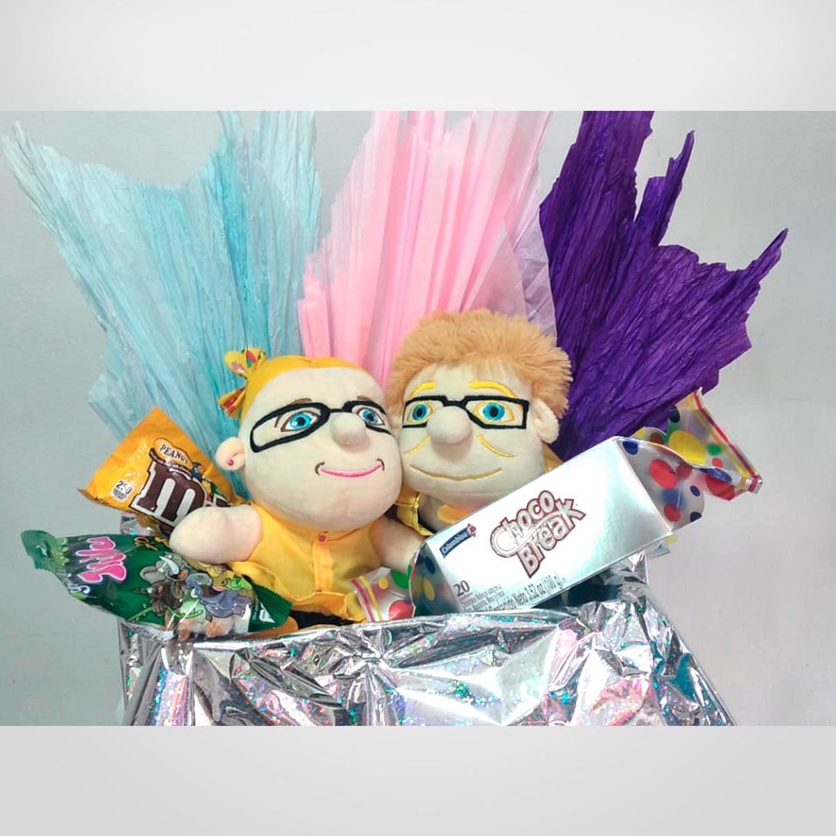 Ancheta con peluches y dulces.