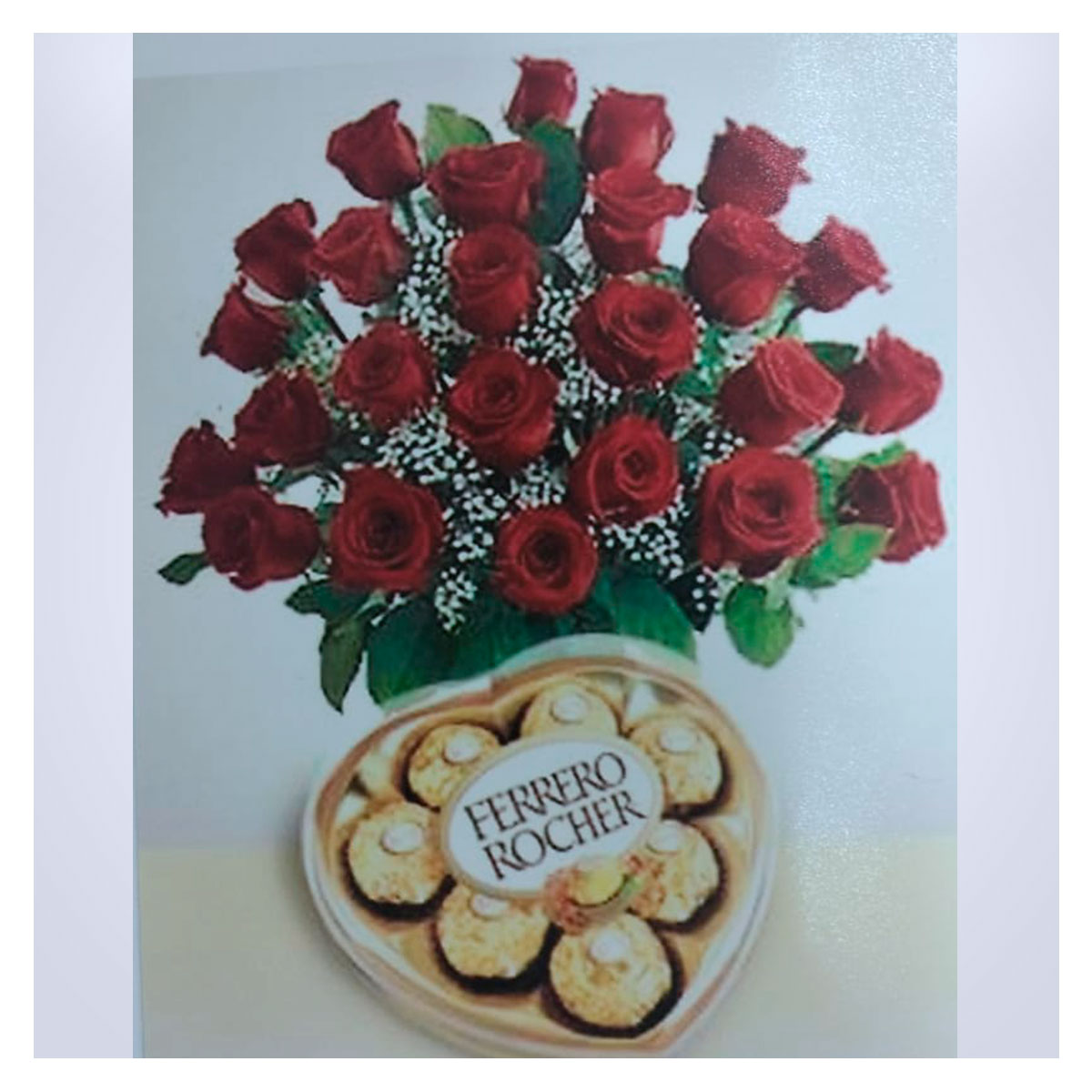 Elaborado con rosas, chocolates ferrero, globo metalizado y tarjeta personalizada.