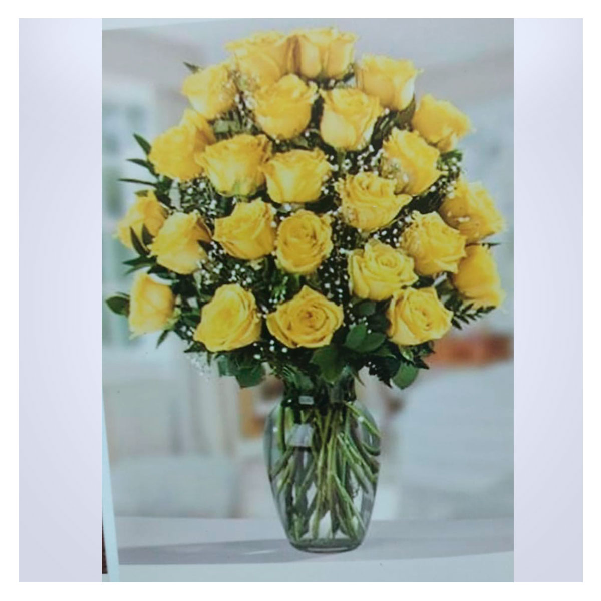 Elaborado con rosas amarillas, base de cristal, ,globo metalizado y tarjeta personalizada.