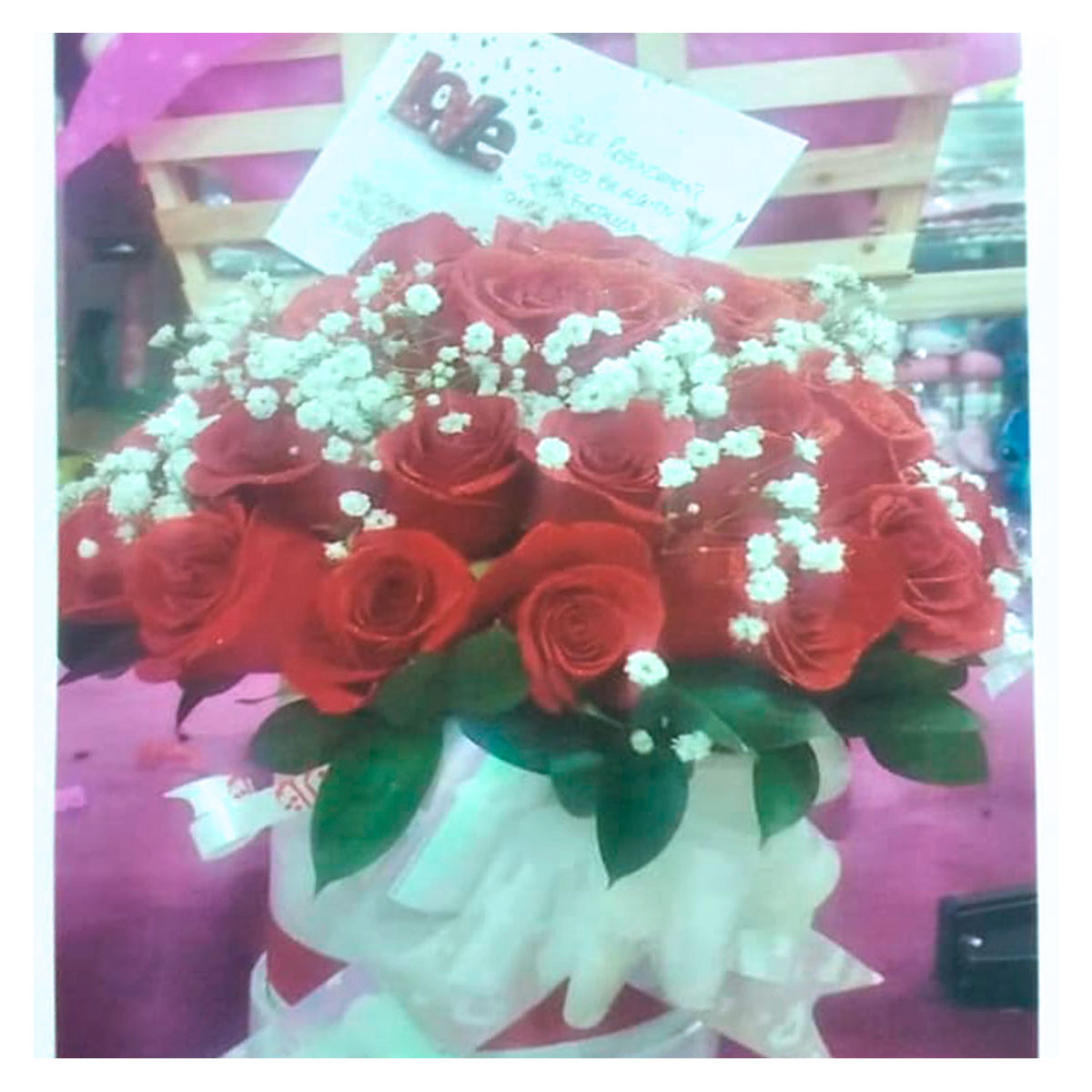 Elaborado con 24 rosas, caja blanca, globo metalizado y tarjeta personalizada.