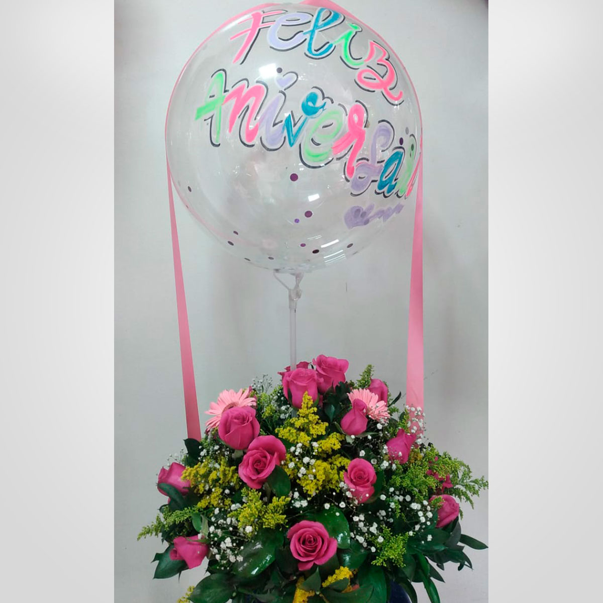 Elaborado con rosas, gerberas, globo metalizado y tarjeta personalizada.