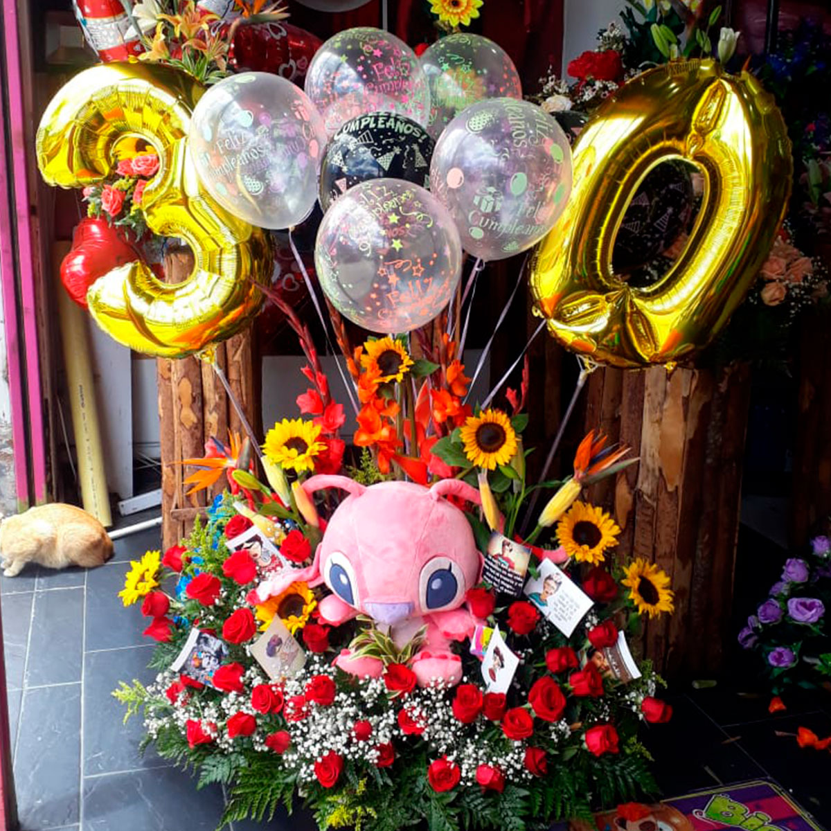 Elaborado con rosas, girasoles, huacal, chocolates, peluche, moño mágico, globo metalizado/helio, números y tarjeta personalizada.