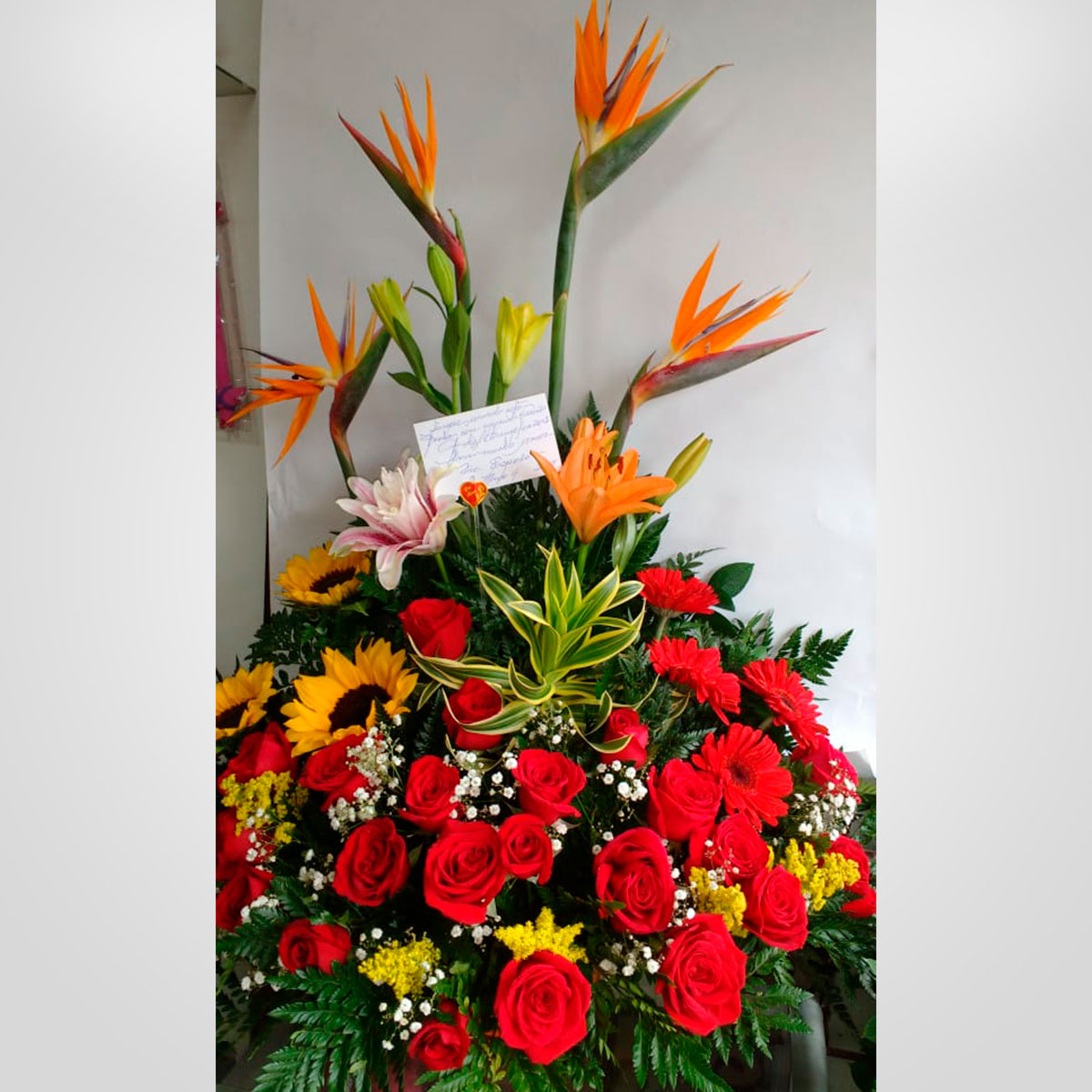 Elaborado con rosas, lirios, girasoles, aves de paraíso, gerberas, canción de la india, globo metalizado y tarjeta personalizada.