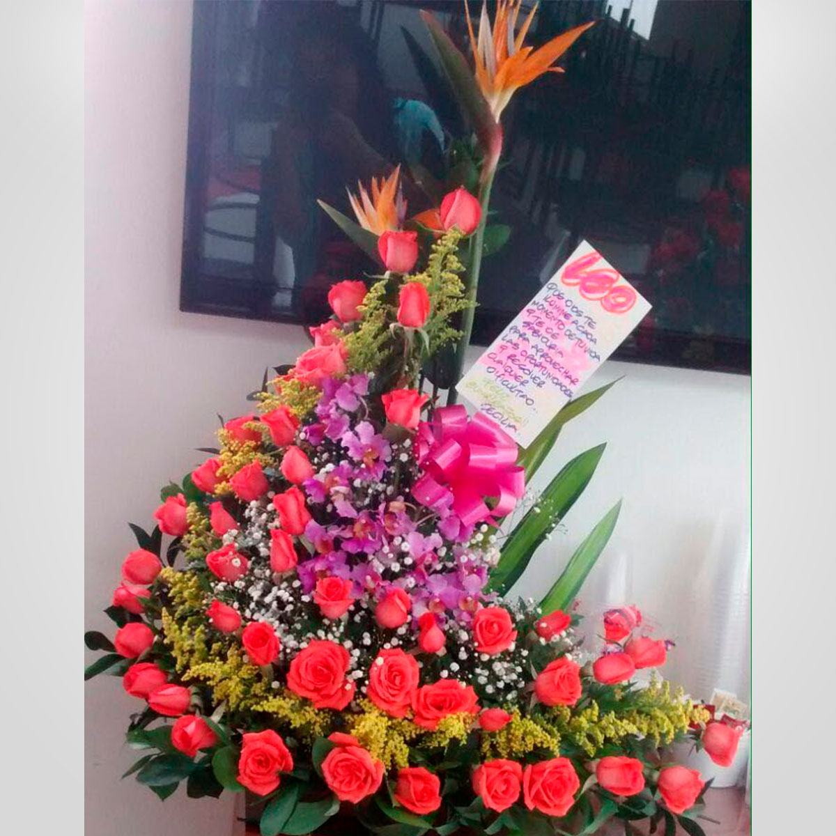 Elaborado con rosas, orquídea hawaiana, aves del paraíso, globo metalizado y tarjeta personalizada.