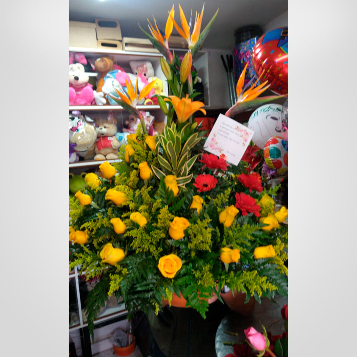 Elaborado con rosas, aves de paraíso, lirios, gerberas, globo metalizado y tarjeta personalizada.