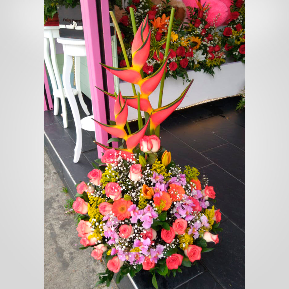Elaborado con rosas, orquídea hawaiana, aves de paraíso, heliconias, globo metalizado y tarjeta personalizada.