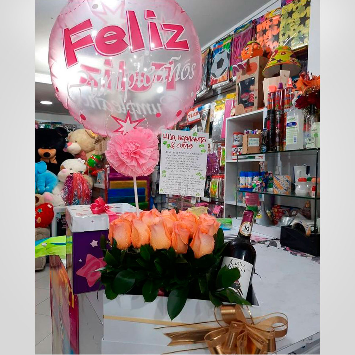 Elaborado con rosas, caja blanca, botella de vino, globo y tarjeta personalizada.