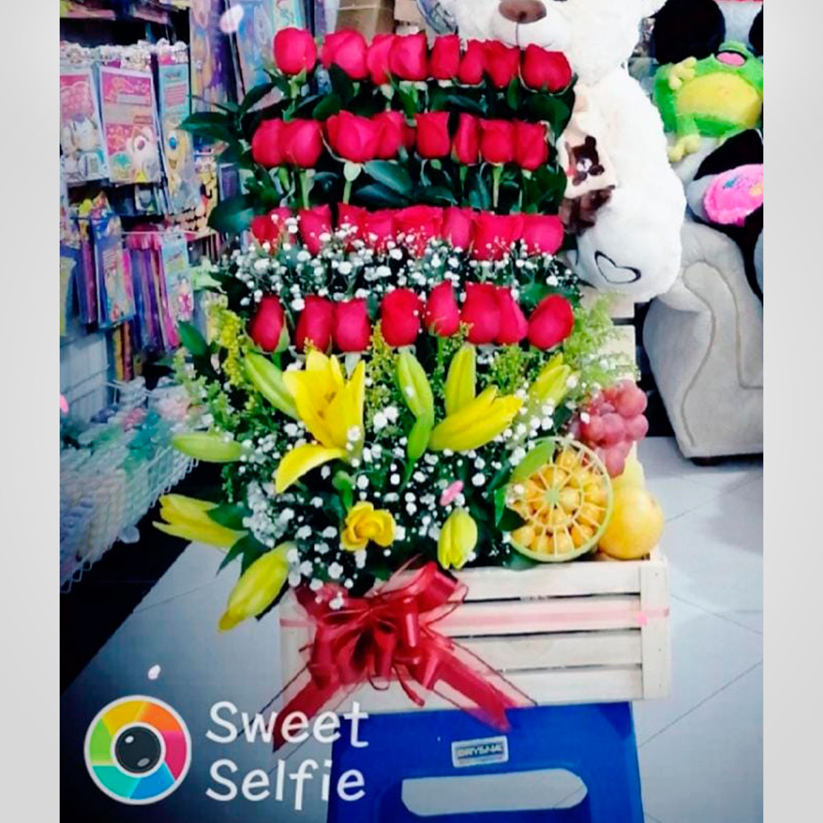 Elaborado con 32 rosas, lirios, gerberas, frutas y huacal.