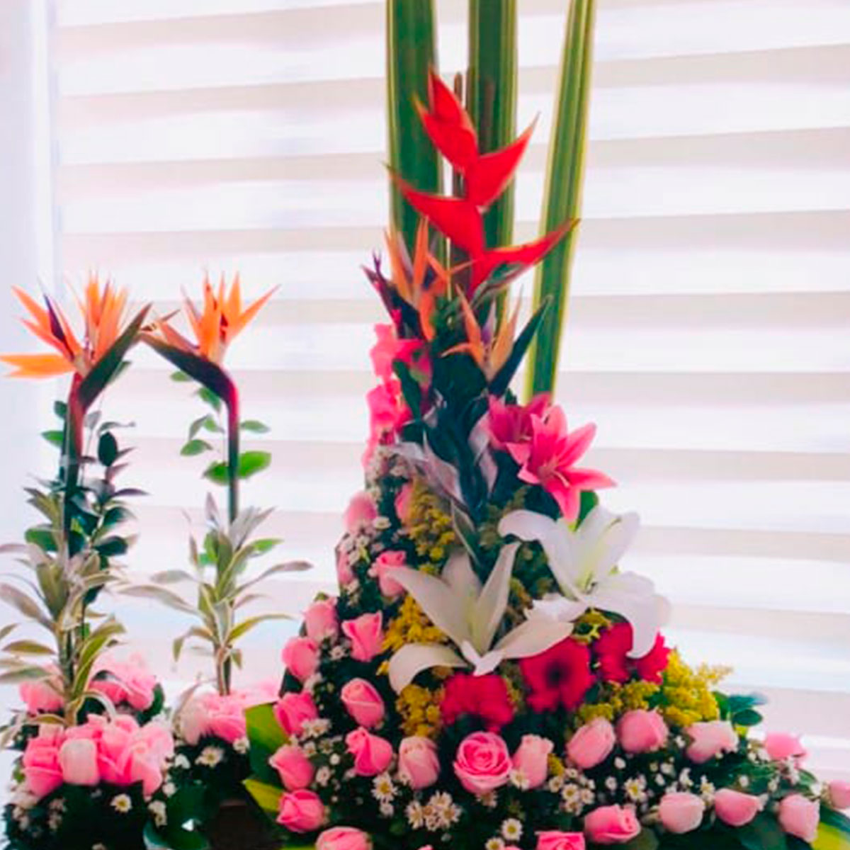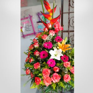 Elaborado con rosas, gerberas, lirios, aves de paraíso, globo metalizado y tarjeta personalizada.