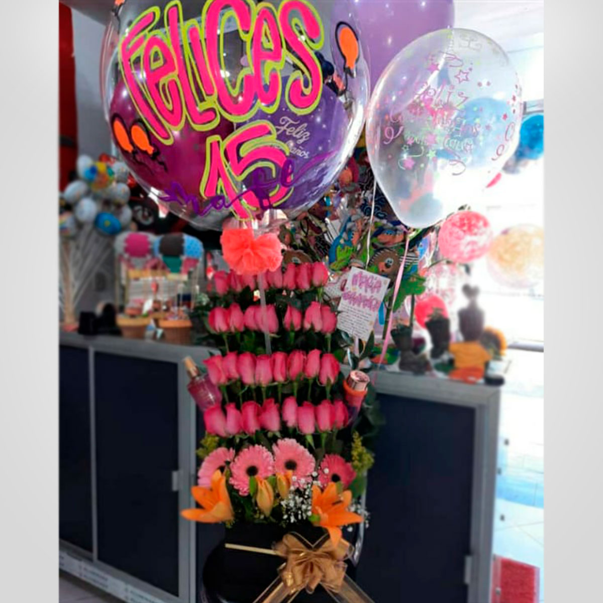 Elaborado con 24 rosas, gerberas, lirios, caja negra, moño mágico, globo y tarjeta personalizada.