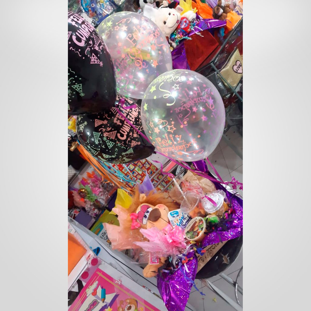 Base de Madera 5 globos de Helio, peluche, chocolate ferrero 8 unidades, mug decorado, menú ejecutivo, Sandwich de jamón y queso y vegetales, chocolate milo o café, jugo de naranja, porción de fruta, porción de queso, dedito de queso orneado, alpinette, tarjeta personalizada.