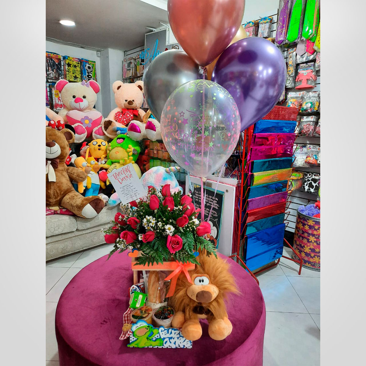 Base de madera de 2 pisos, arreglo floral, peluche, 5 globos en helio, menú ejecutivo, Sandwich de jamón y queso y vegetales, chocolate milo o café, jugo de naranja, porción de fruta, porción de queso, dedito de queso orneado, alpinette, tarjeta personalizada.