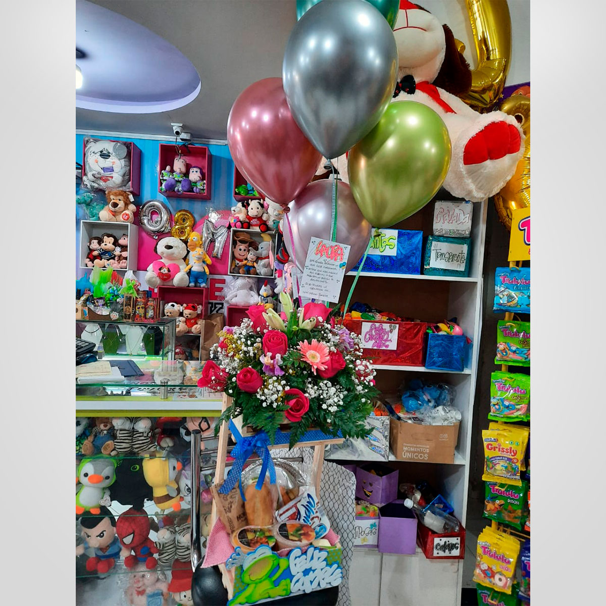 Base de madera de 2 pisos, arreglo floral, 5 globos en helio, menú ejecutivo, Sandwich de jamón y queso y vegetales, chocolate milo o café, jugo de naranja, porción de fruta, porción de queso, dedito de queso orneado, alpinette, tarjeta personalizada.