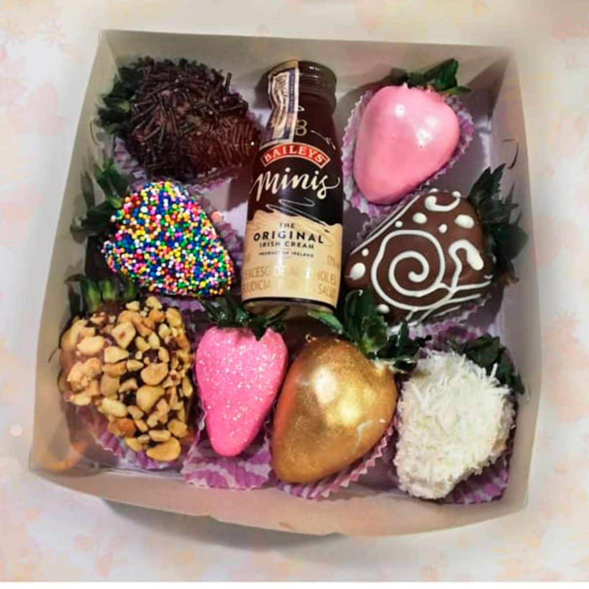caja de Fresas con chocolate, un 1/4 de Baileys.