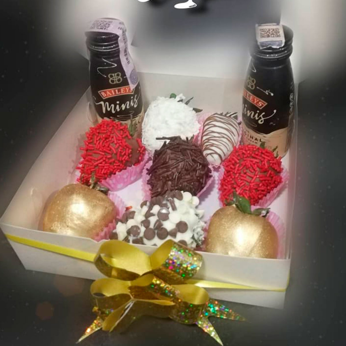 Caja de fresas con chocolate, 2 cuantos de Baileys.